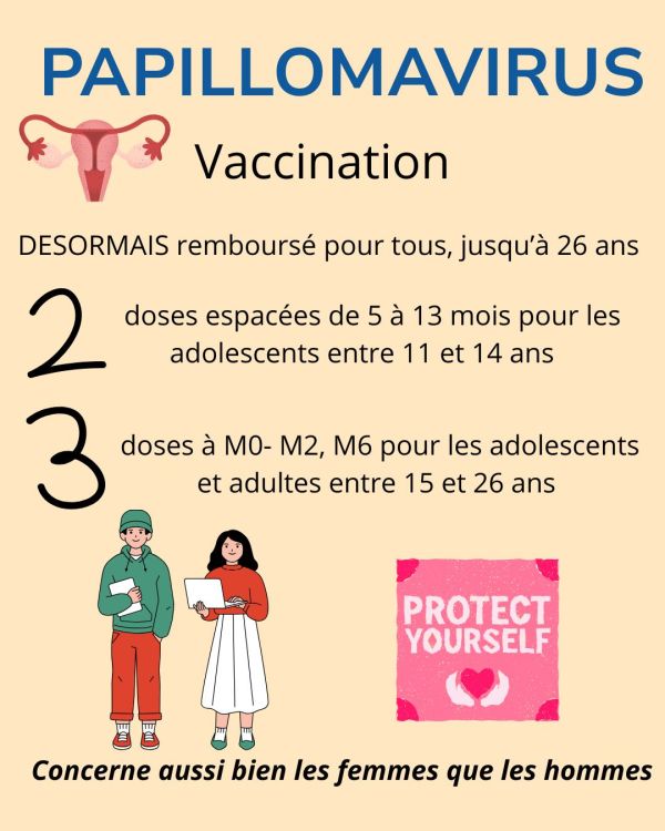 Vaccin pour le papillomavirus désormais remboursé jusqu'à 26 ans, n'hésitez pas à venir nous voir ou nous téléphoner pour plus de détails ou conseils.